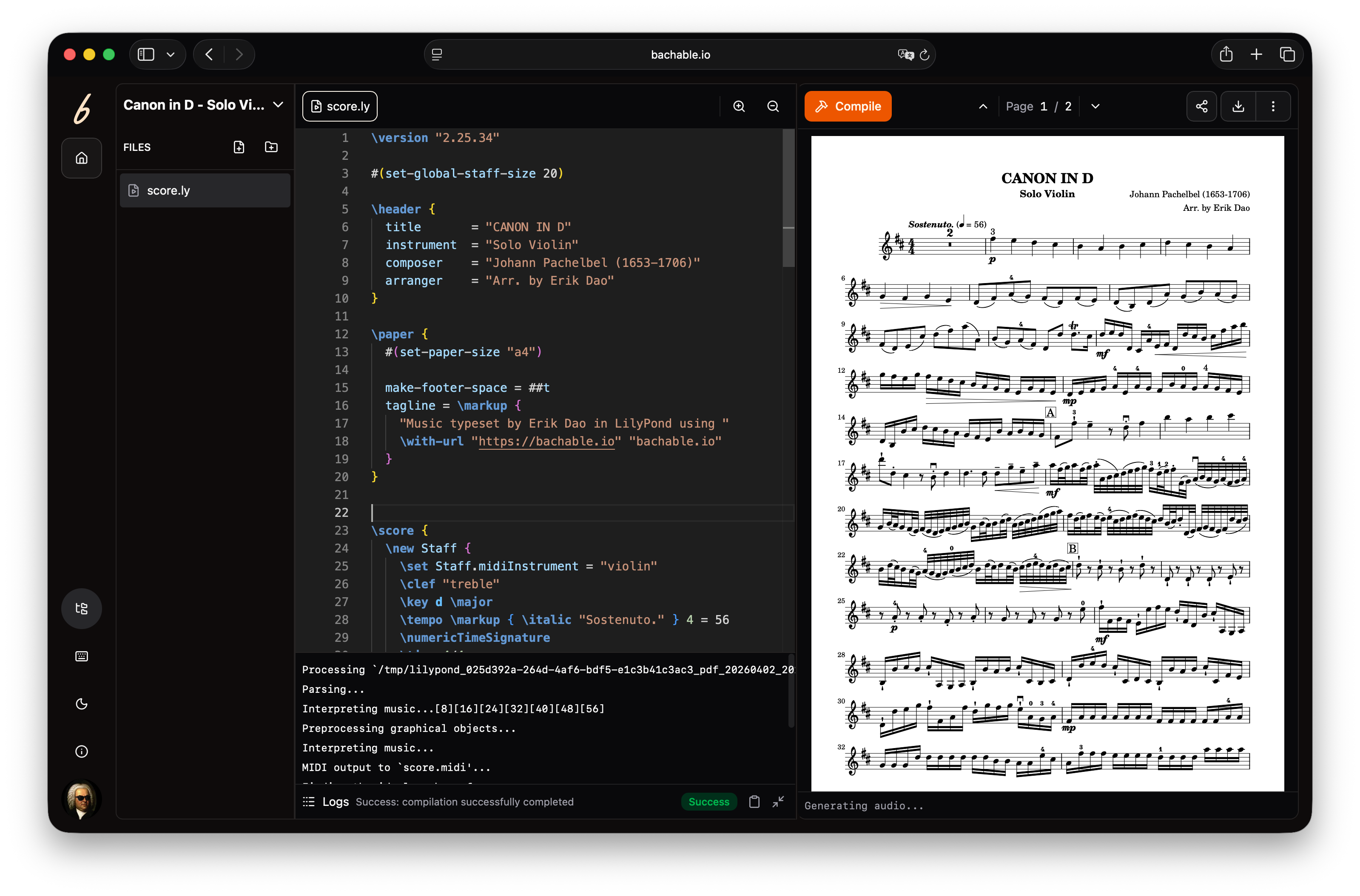 Browser-based music notation powered by LilyPond. Publication-quality scores, instant preview, multi-format export. No installation required.